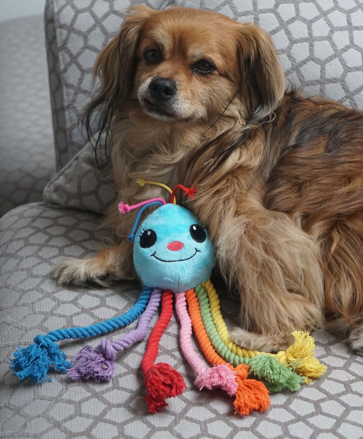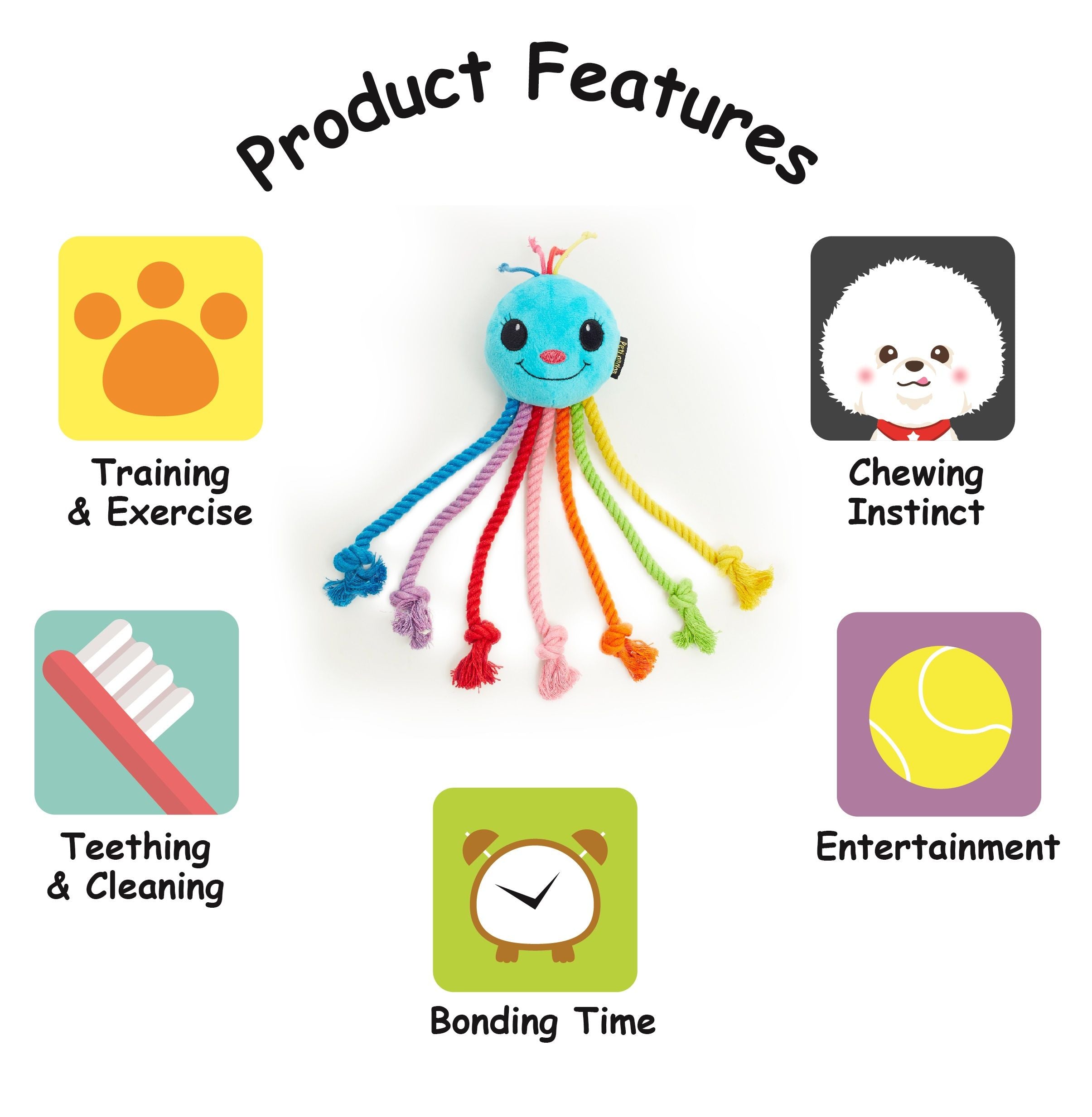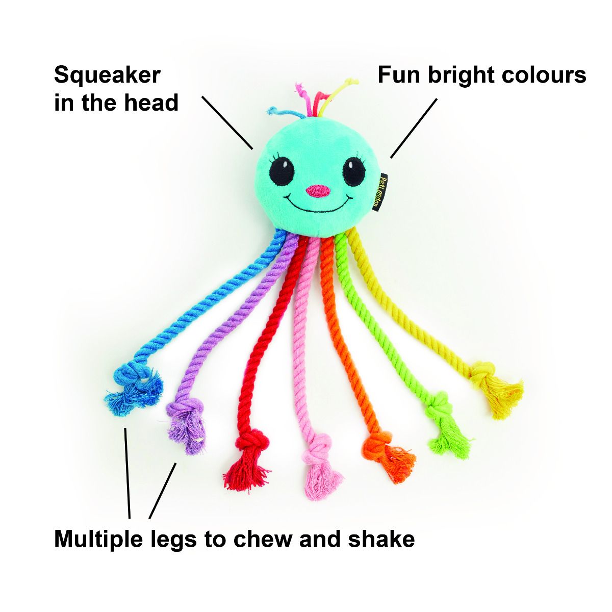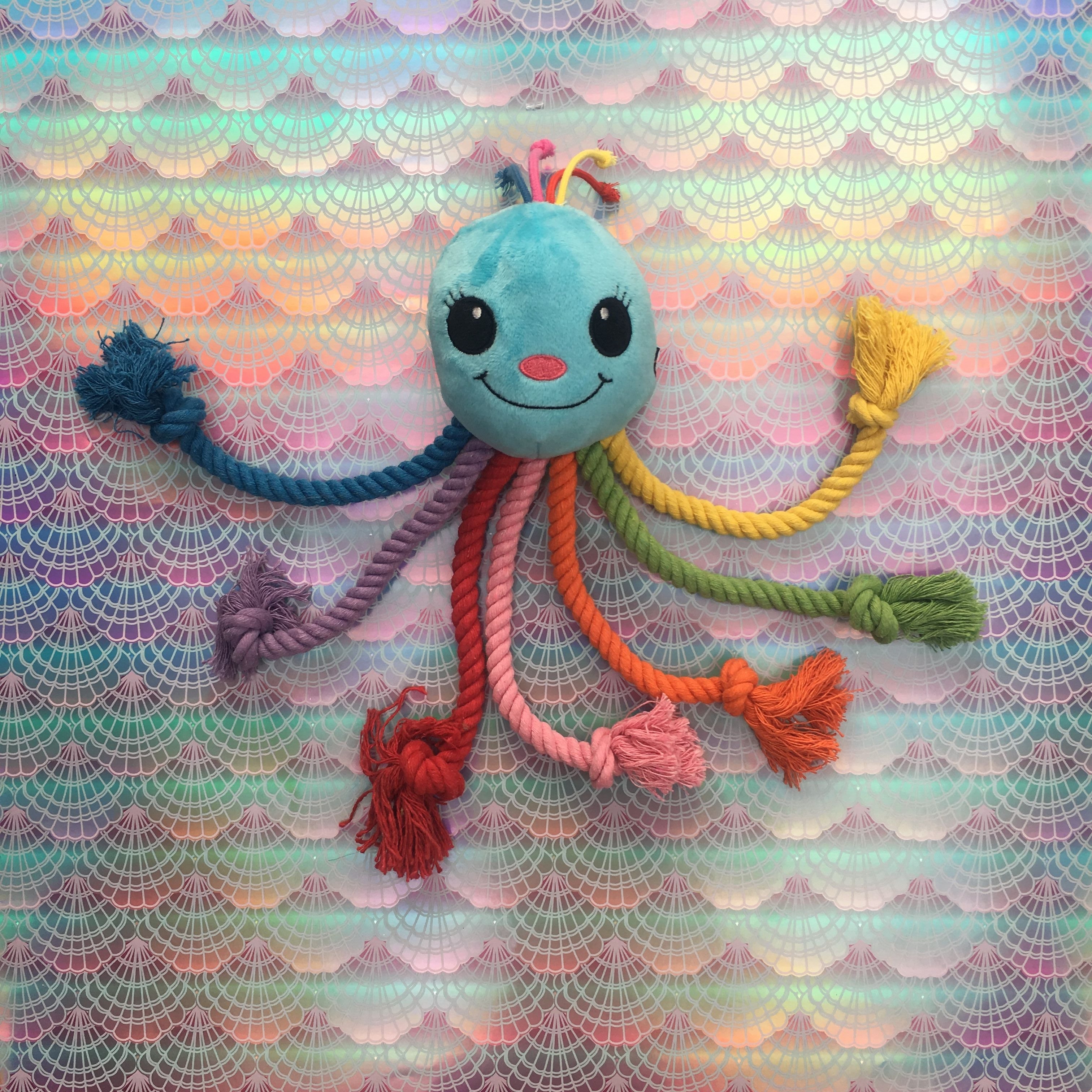 Dogs will love to thrash the legs about and carry it in their mouth. The rope material on the legs will help with teething, as well as flossing your dog's teeth whilst they chew. This is a dual textured toy, in addition to the rope, the Head offers a different, softer plush texture for your dog to enjoy chomping or nuzzling. There is a Squeaker inside the head for added delight and cute colourful tassels on the head. The rainbow octopus will be a welcome addition to your pups toy box