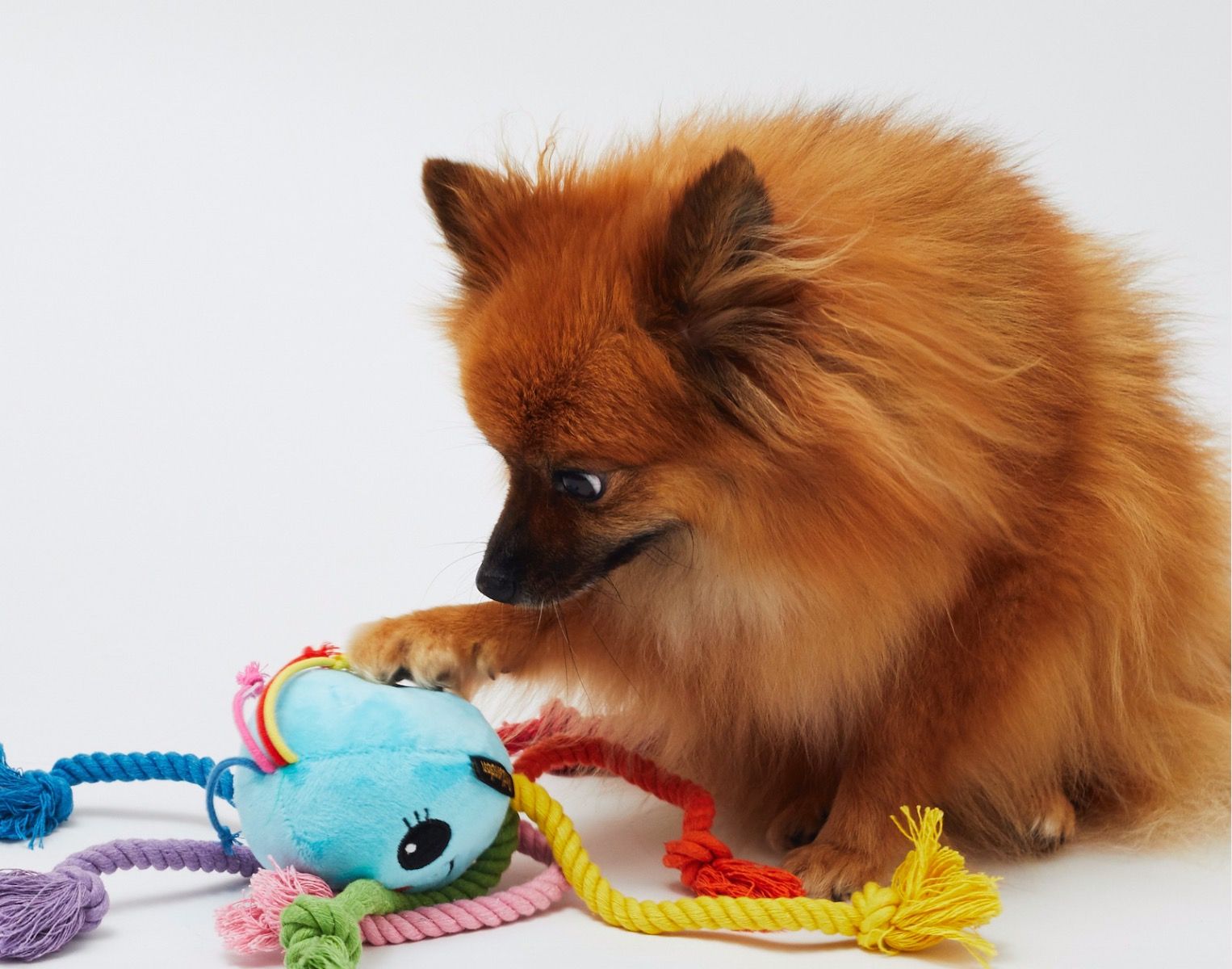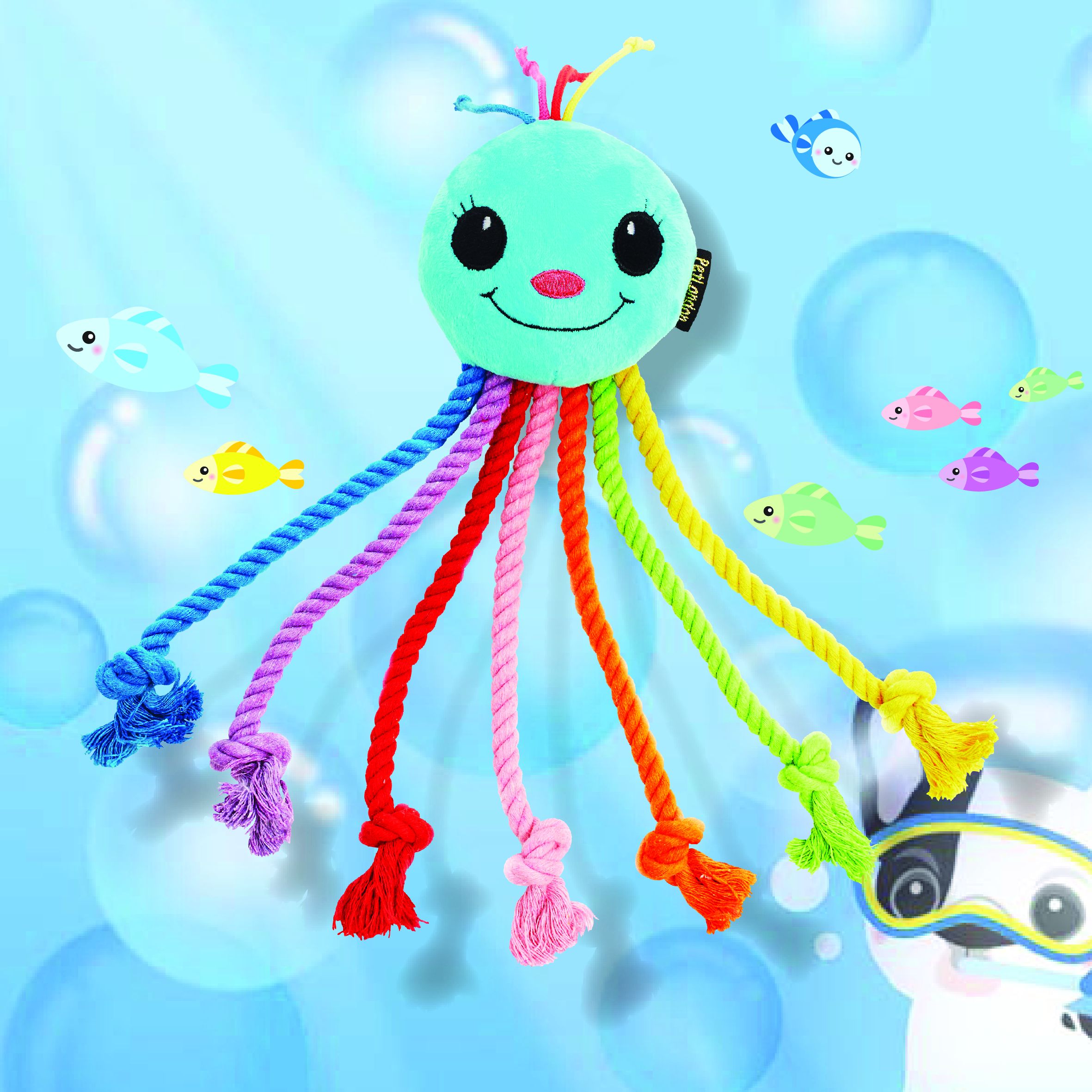 PetLondon's Rainbow Octopus soft plush toy features seven multicolour rainbow rope dangling legs. Great for tug and games of interactive fetch, dogs will have a great time shaking this toy around. The legs are made from rope and help to clean their teeth as they play.